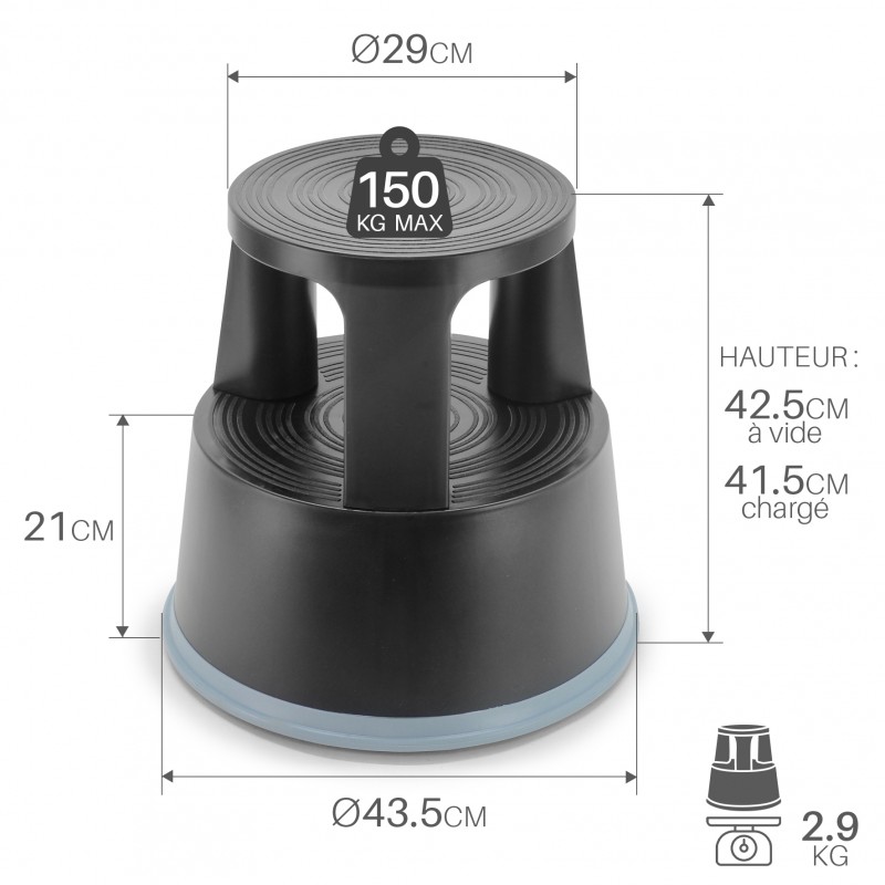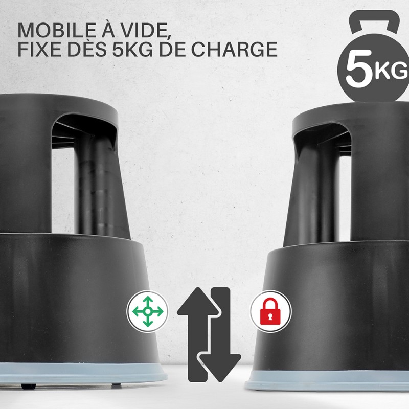 Tabouret marche pied en plastique renforcé, sur roulettes, se déplace facilement à vide, et se bloque au sol dès 5 kg de charge . Matériaux robuste, incassable et recyclable.