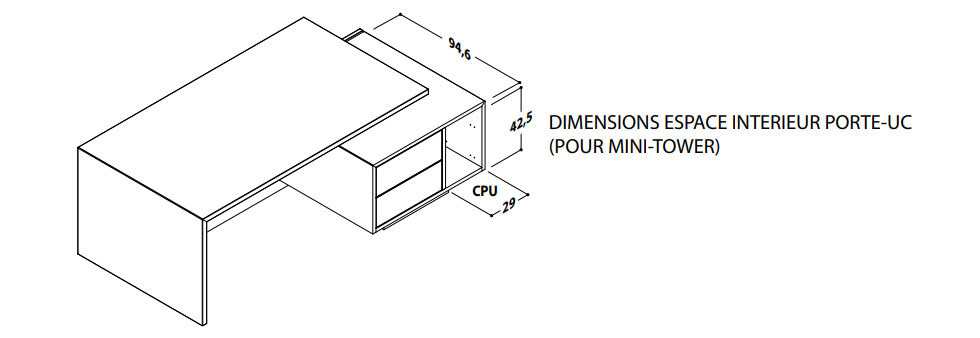 Le plateau et le côté du bureau (Finition Peuplier Clair ou Peuplier Brun) sont constitués de panneaux de particules de 35 mm d’épaisseur, mélaminés, avec chant ABS 2 mm assorti