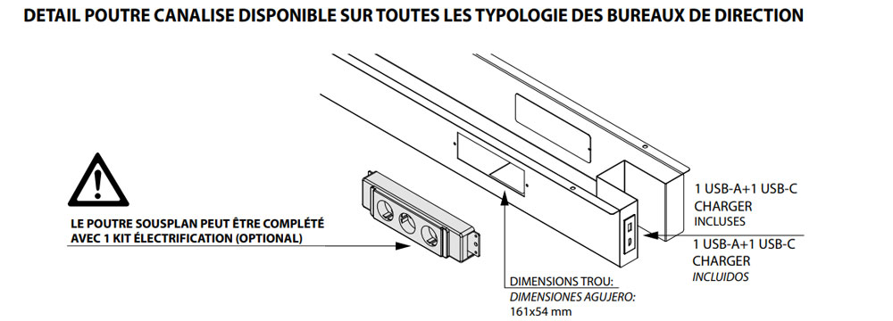 Sous le plateau se trouve une poutre structurelle canalisée adaptée au câblage et équipée de 2 ports USB "charger" et avec kit 3 prises pour être inséré le long