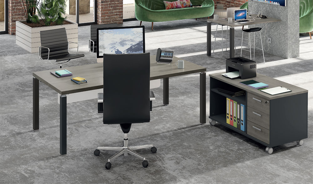 Desserte : L 120 x P 60 x H 63 cm, positionnable à droite ou à gauche (plumier inclus) : corps anthracite, façades des tiroirs et dessus 2 coloris au choix assortis au plateau du bureau