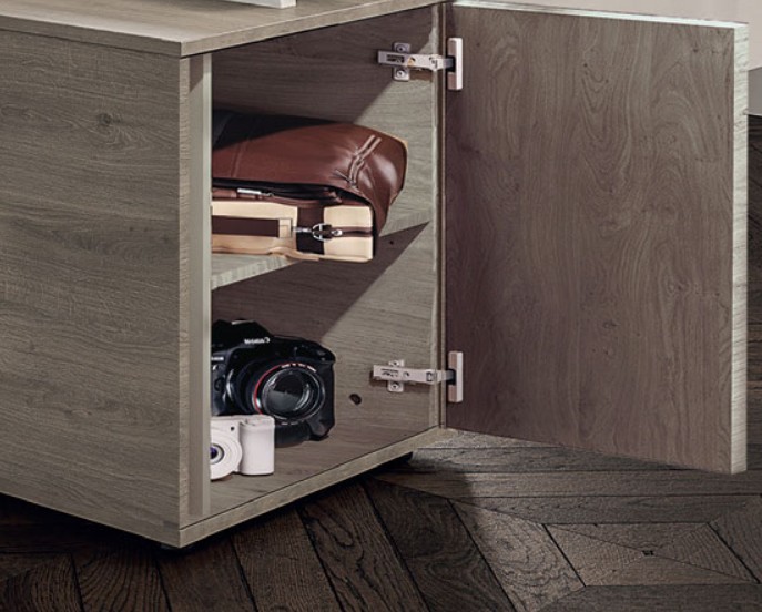 La console dispose d’une porte masquée accessible coté visiteur pour un rangement discret ou pour y mettre un mini bar