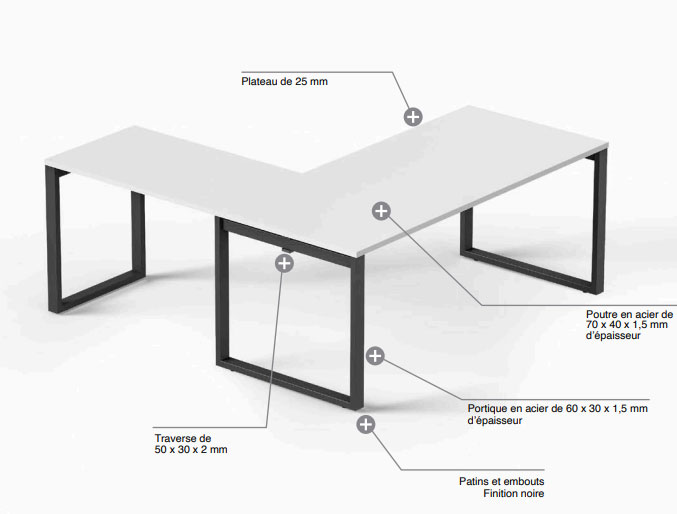 Bureau avec retour V-NEXT pieds fermés en couleur