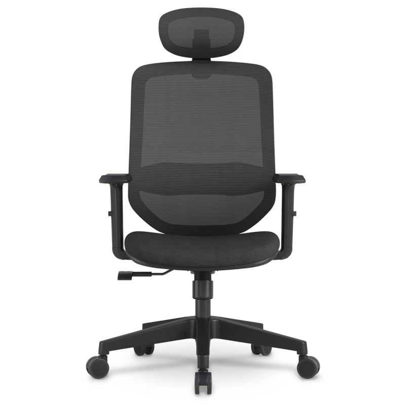 Fauteuil de travail noir gamme pro. Assise tissu élastique résistant. Dossier et appui-tête maille respirante. Appui-tête réglable 2D. Accoudoirs réglables manchette soft touch. Soutien lombaireintégré. Mécanisme basculant synchrone 1 position. Pied nylon renforcé.