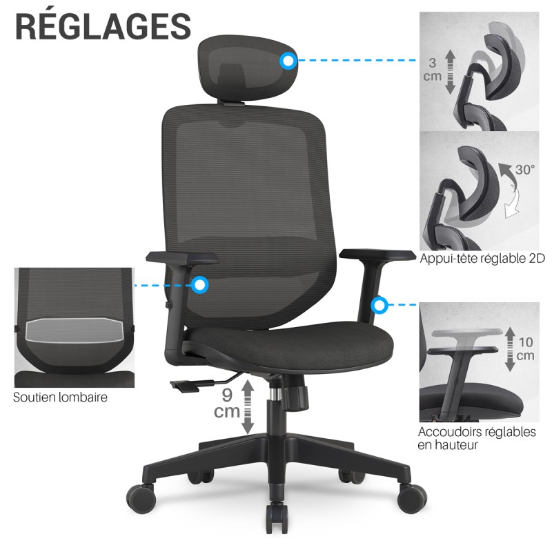 - Appui-tête réglable 2D : hauteur (3 cm), inclinaison (30°)