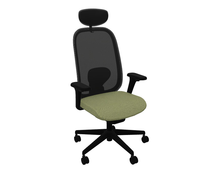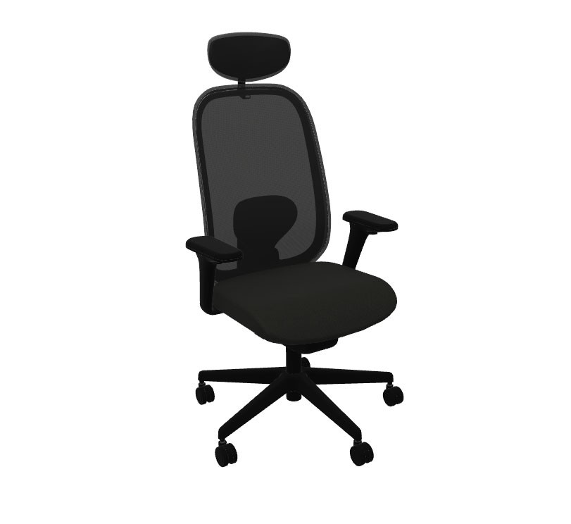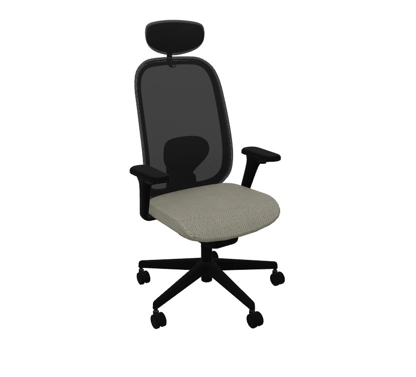Têtière : cadre périmétrique injecté en polypropylène recouvert d’une résille 3D noire, réglable en hauteur avec course de 65 mm
