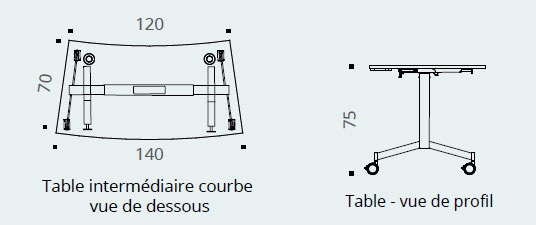 Table tonneau EUREKA avec 4 plateaux rabattables (avec 2 tables extrémité trapèze + 2 tables intermédiaires courbes)